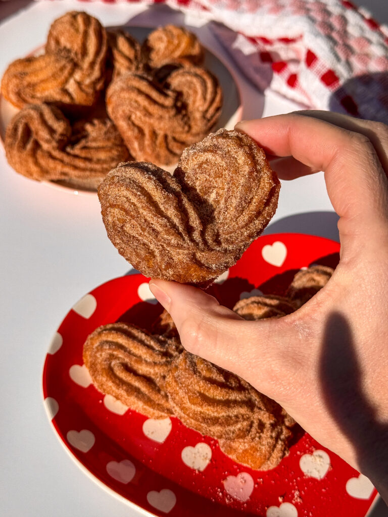 Something I always look forward to when visiting Disneyland is biting into a fresh, crunchy churro. I’ve been missing the parks a little extra lately so I decided to bring that luxury into my own kitchen and make them at home. With Valentine’s Day coming up, I piped these ones into hearts and I truly think there’s no cuter treat to celebrate!