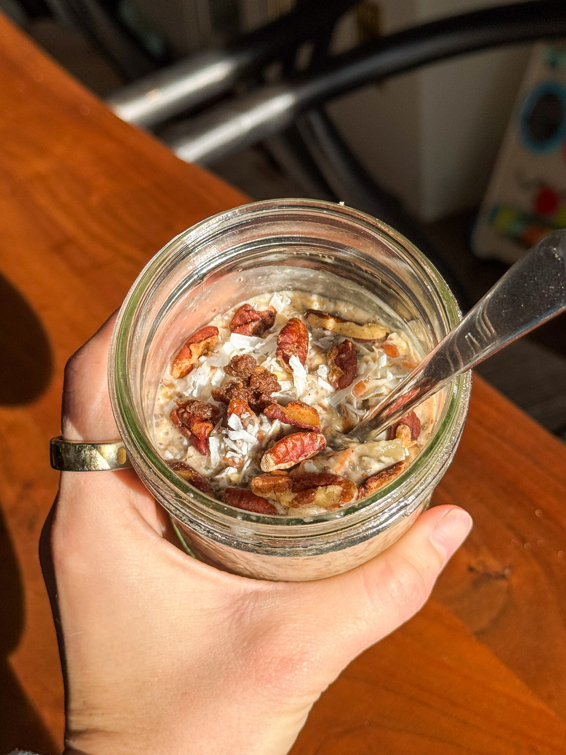 These aren’t just your basic oats thrown in a jar. We’re talking grated carrots, cinnamon, nutmeg, a little vanilla, and all the cozy flavors you know and love from the real thing — but in a form you can actually justify eating before noon. I also boosted these with protein powder, chia seeds, and flax seed because we love a breakfast that actually keeps us full. Toddler life is no joke and I need something that’s going to hold me over until lunch without thinking about snacks every 20 minutes.
