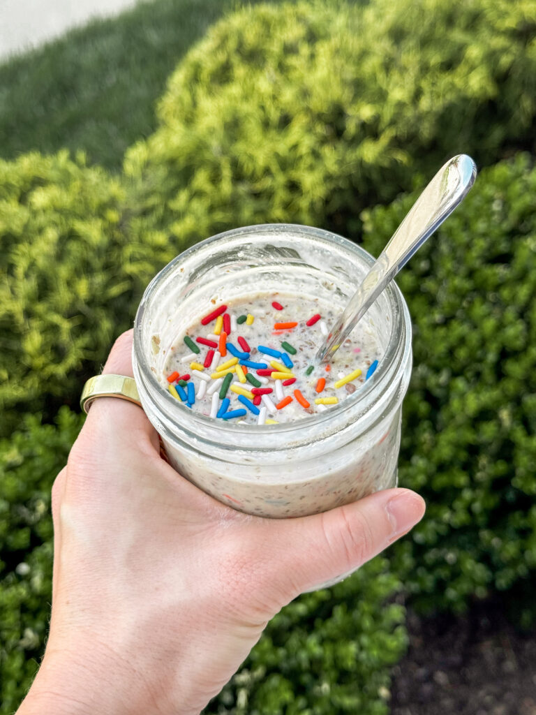 - Add all ingredients except sprinkles into a 16oz minimum mason jar and shake well to combine all ingredients.